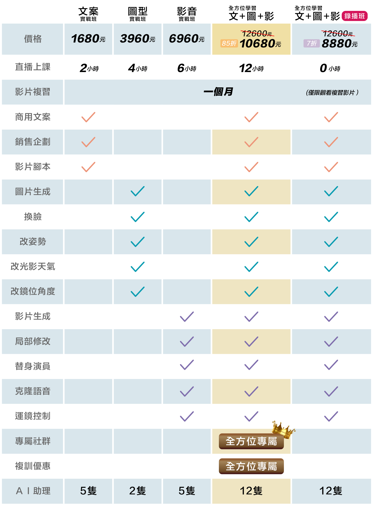 倘若有2堂以上的需要,真心推薦您報名「全方位學習」,3堂全上, 除了價格實惠(享85折優惠、$10680;原價:$12600 ),資源(完整的AI助理)、加值服務(學員專屬討論社群、學員複訓5折優惠)也最完善;
